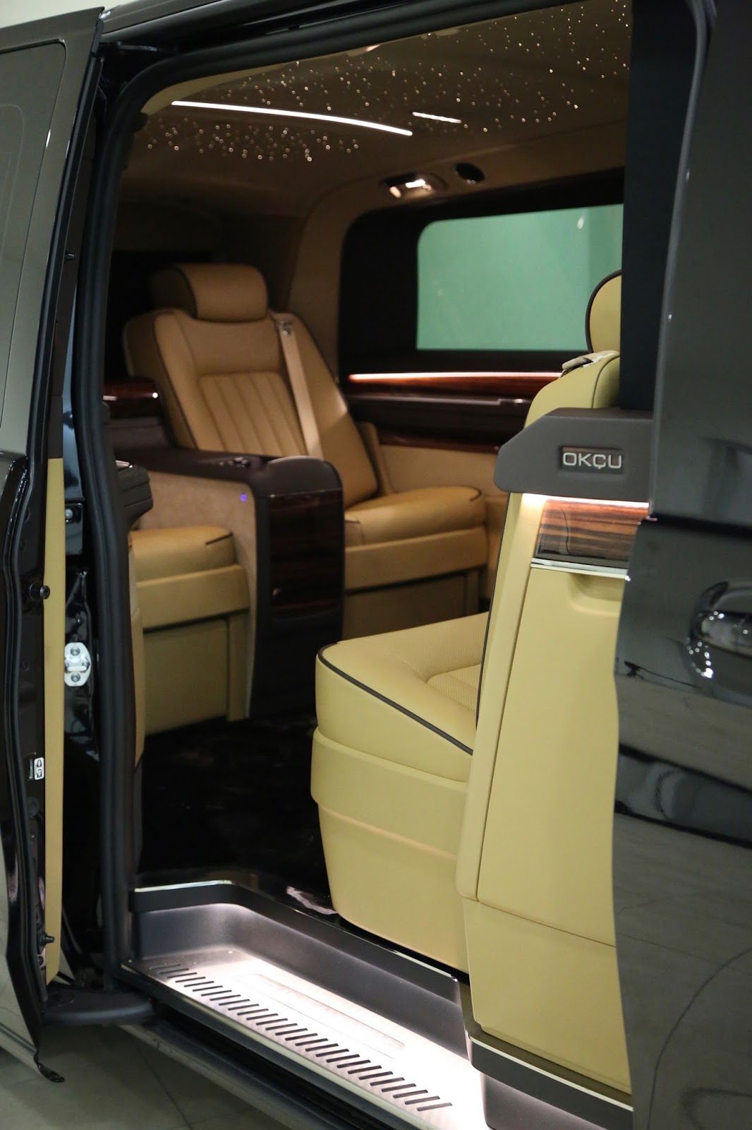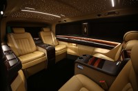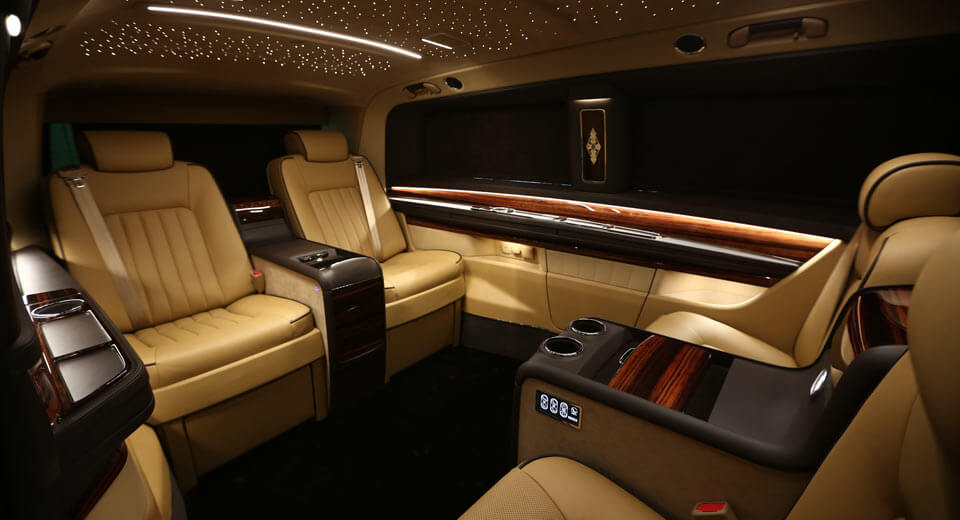 OKCU has totally transformed the interior, fitting four leather seats at the back that face other. Additionally, the roof lining has taken obvious design inspiration from Rolls-Royce’s Starlight Headliner, and two prominent armrests and center consoles are found in between the seats.