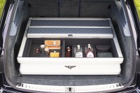 Billed as the “ultimate field sports lifestyle accessory,” the one-off model is essentially a standard Bentayga which has been equipped with a custom storage unit that is constructed out of leather and aluminum. The sliding storage unit features an assortment of different compartments which can hold shotgun shells, binoculars, and ear muffs. The compartment is lockable and also includes a humidor as well as several different drink holders and a flask.